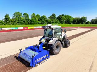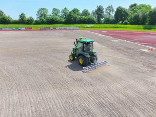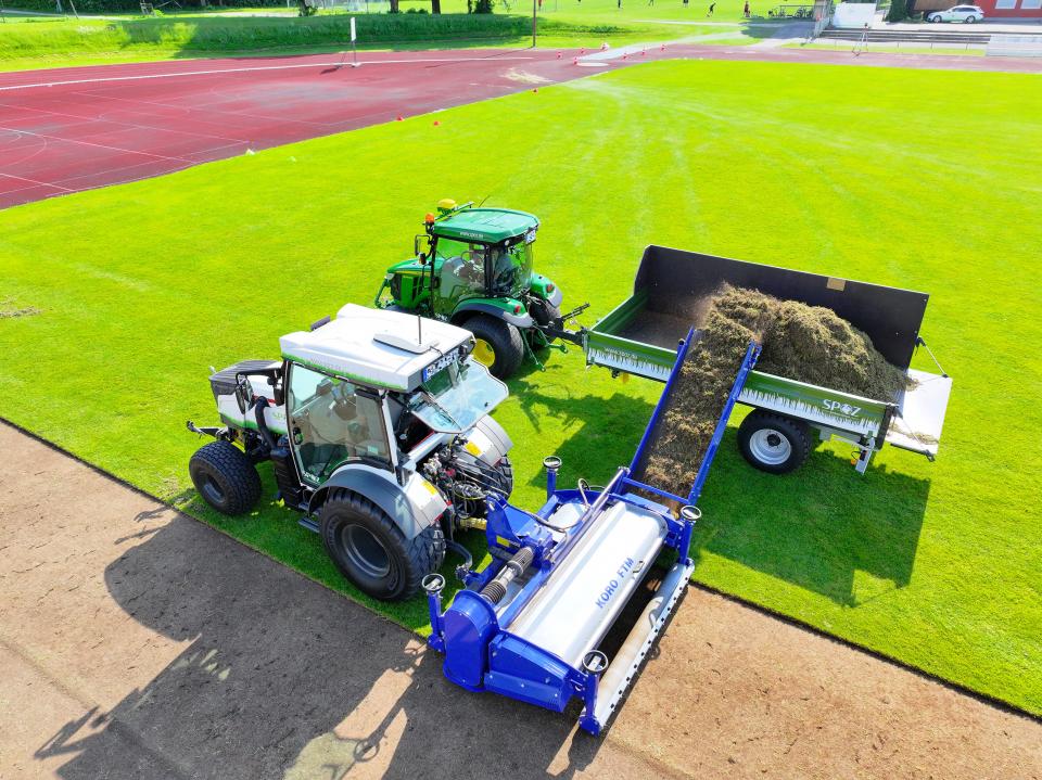 Im nächsten Schritt wird die bestehende Rasentragschicht (RTS) aus bis zu 20 cm Tiefe mit dem Recycling Dresser aus dem Boden gefräst und mit dem neuen Sand vermischt, gleichzeitig erfolgt durch diesen Arbeitsschritt eine Tiefenlockerung.